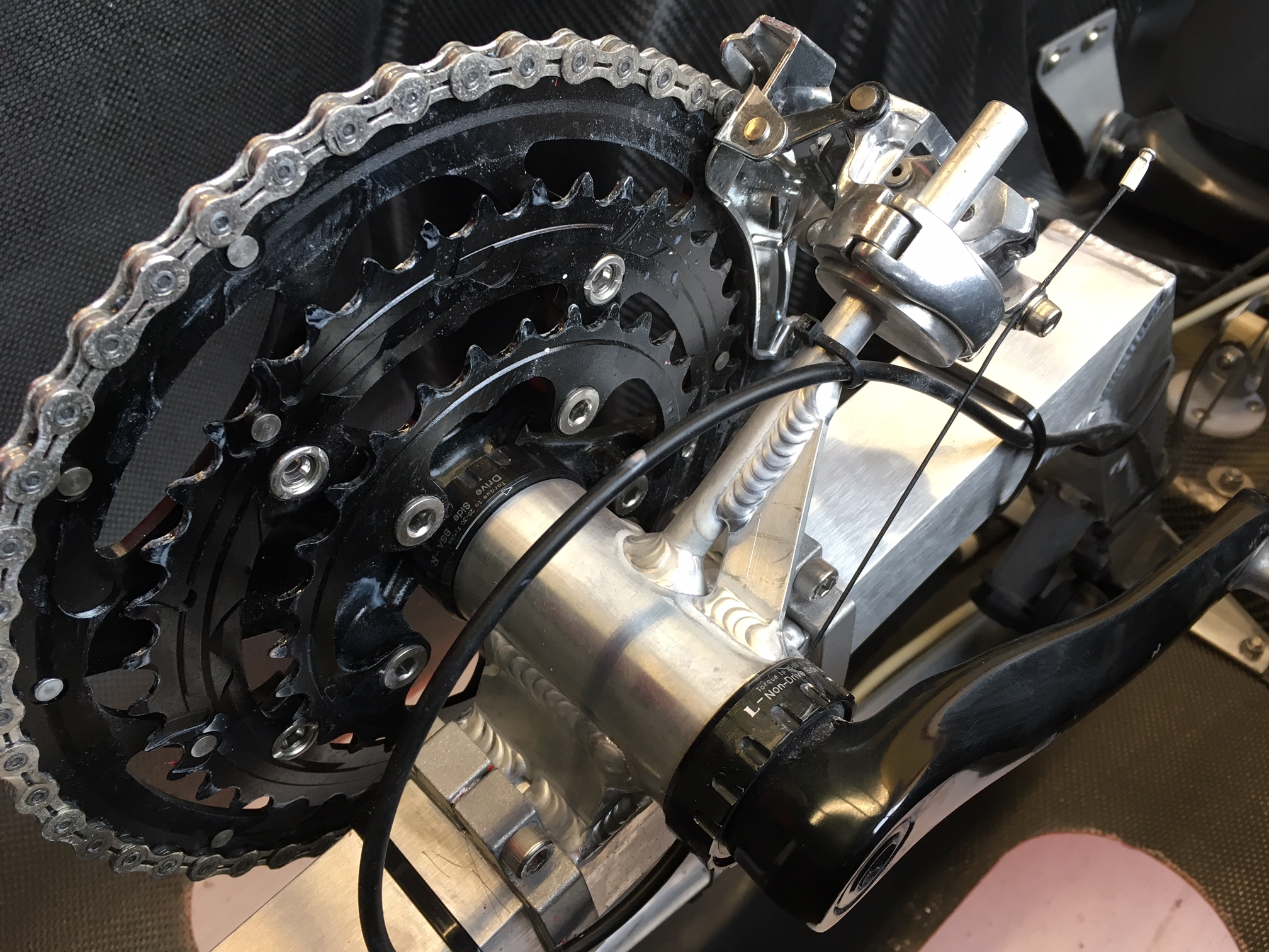 Now we use a Sram X9 low pull triple derailleur , and the pin it is mounted on is reinforced with a plate. This way the shifting is more direct and precise. And there is less chance of derailling.